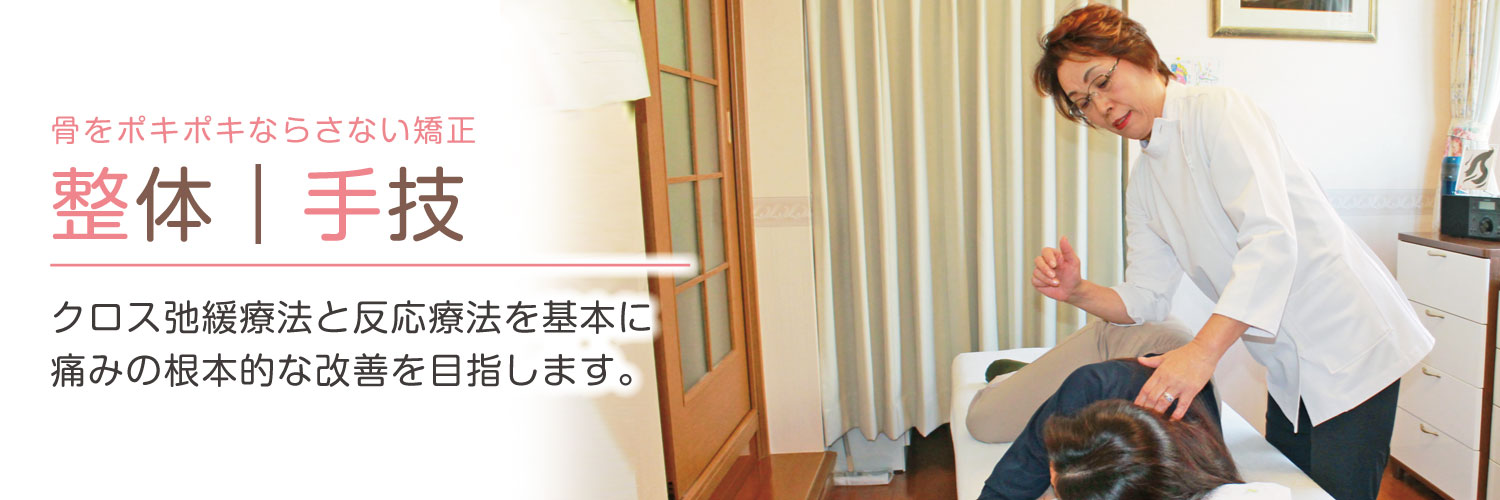 クロス弛緩療法と反応療法を基本に痛みの原因を探し出し根本的な改善を目指します。 瞬時に体が変わるクロス弛緩療法は患者様に特に好評です。