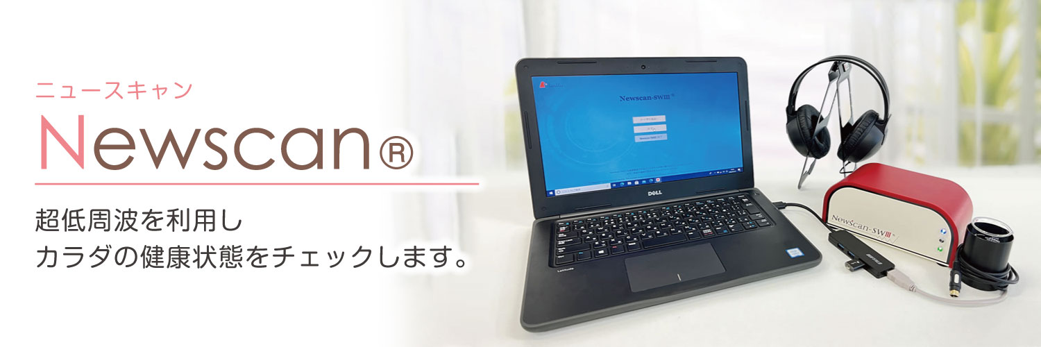 健康管理チェック機器Newscan®(ニュースキャン)は、超低周波音を利用し膨大なデータをコンピューターで 処理できる形に置き換え分析、検索を行い、体の健康状態や様々な情報をチェックします。